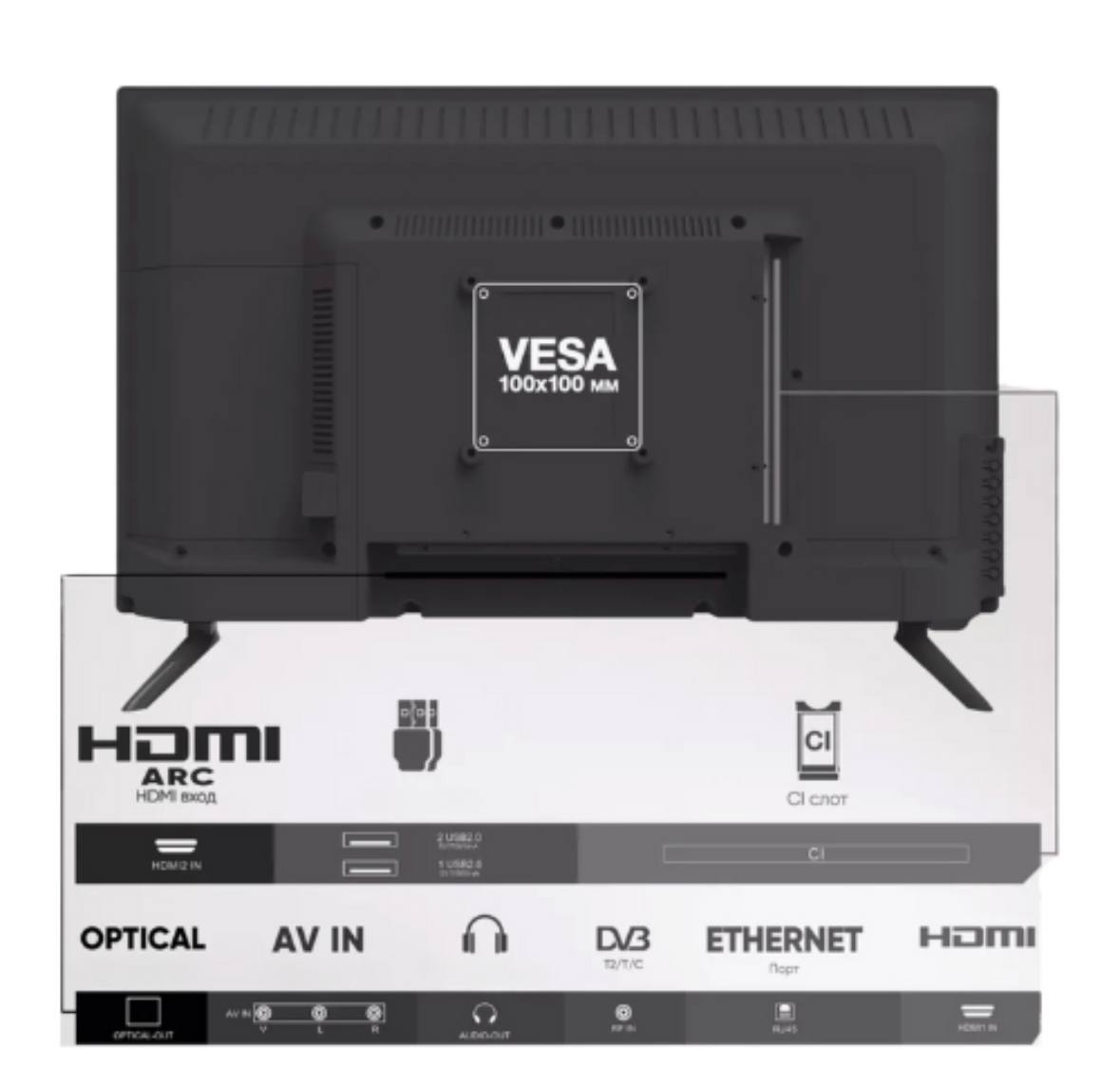Телевізор має чорний корпус, що ідеально впишеться в приміщення з будь-яким дизайном. Крім того, невелика вага телевізора дозволяє без проблем почепити на стіну, скориставшись кріпленням VESA, яке йде у ПОДАРУНОК!